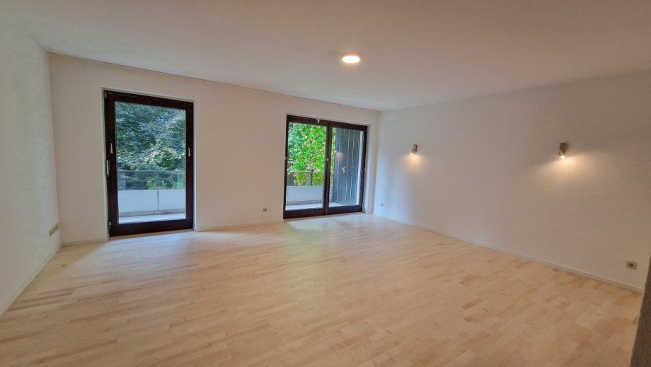 o Großes, helles Wohnzimmer mit bodentiefer Fensterfront und direktem Zugang zum Balkon
